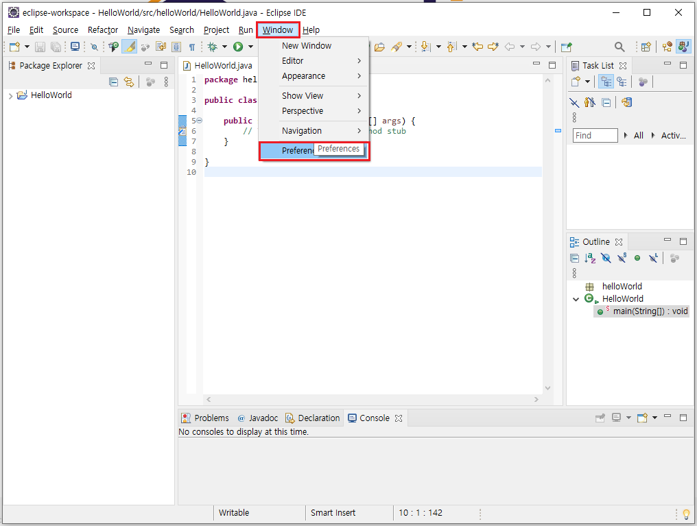이클립스를 실행하면 상단 메뉴 중 Window가 있습니다.