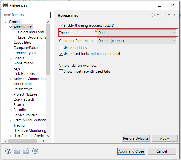 Preferences 창이 열리면 좌측 메뉴 중 Genereal - Appearance - Theme을 Dark로 설정해준 후