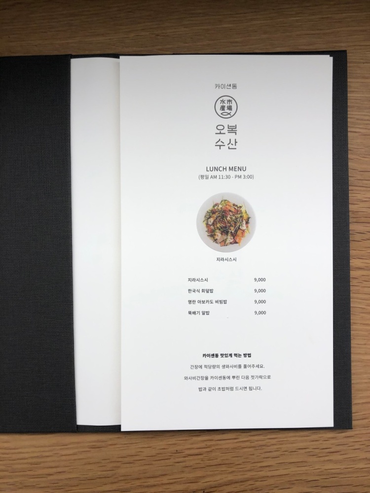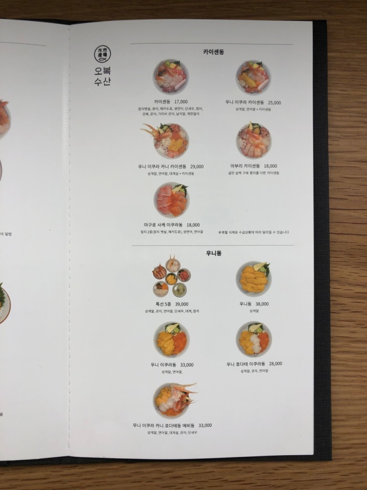 일식을 좋아하신다면 오복수산의 카이센동을 추천드립니다.