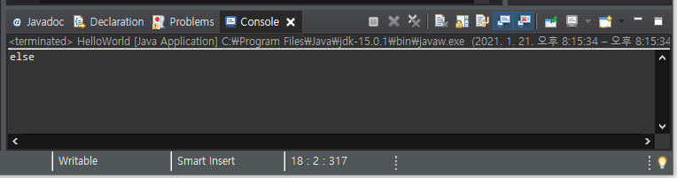 이번에는 else if 뒤의 괄호의 결과 또한 false이므로 아래의 else 뒤의 중괄호로 들어가 'else'가 출력됩니다.