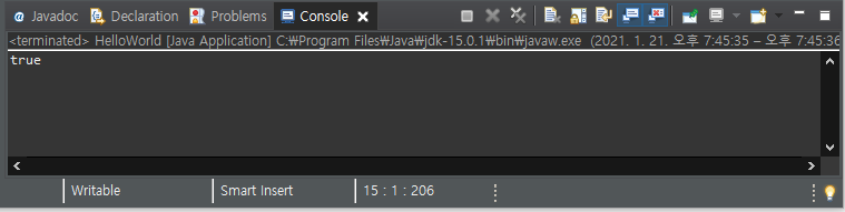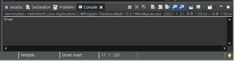 해당 코드를 실행할 경우, 아래와 같이 'true'가 출력됩니다.