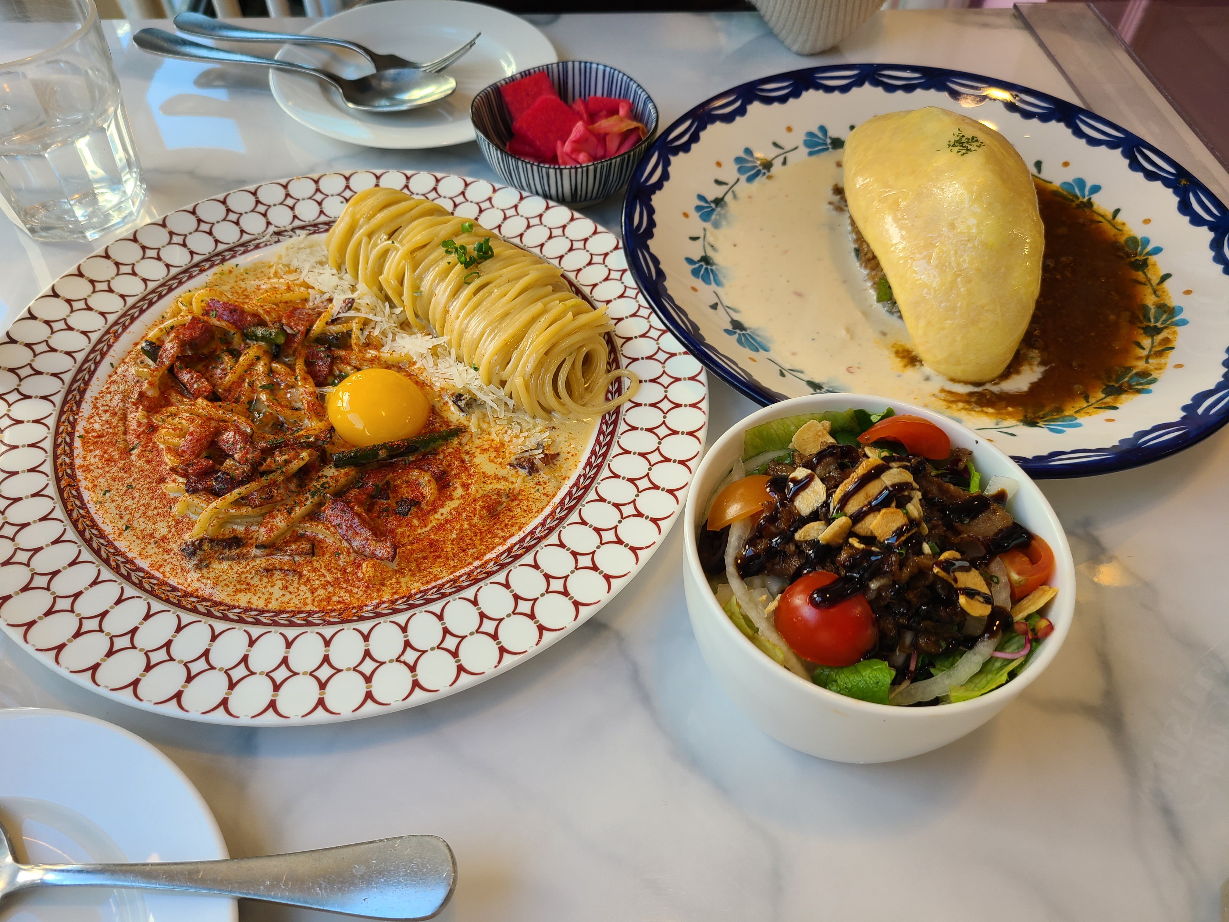 그렇지만 파스타와 오므라이스가 너무 맛있어서 그 둘에 집중하느라 샐러드가 마지막까지 남아있었습니다.