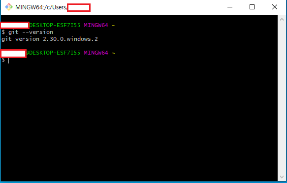Git Bash를 실행 후 아래 커맨드를 입력했을 때 설치한 버전이 출력되면 설치가 완료된 것입니다.