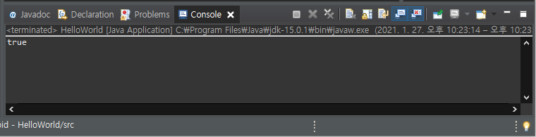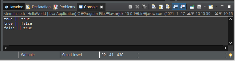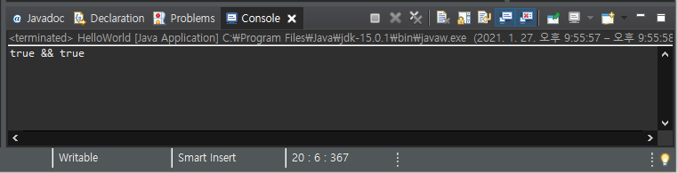 3가지 경우 중 가장 첫 번째 경우인 "true && true"만 출력되었습니다.