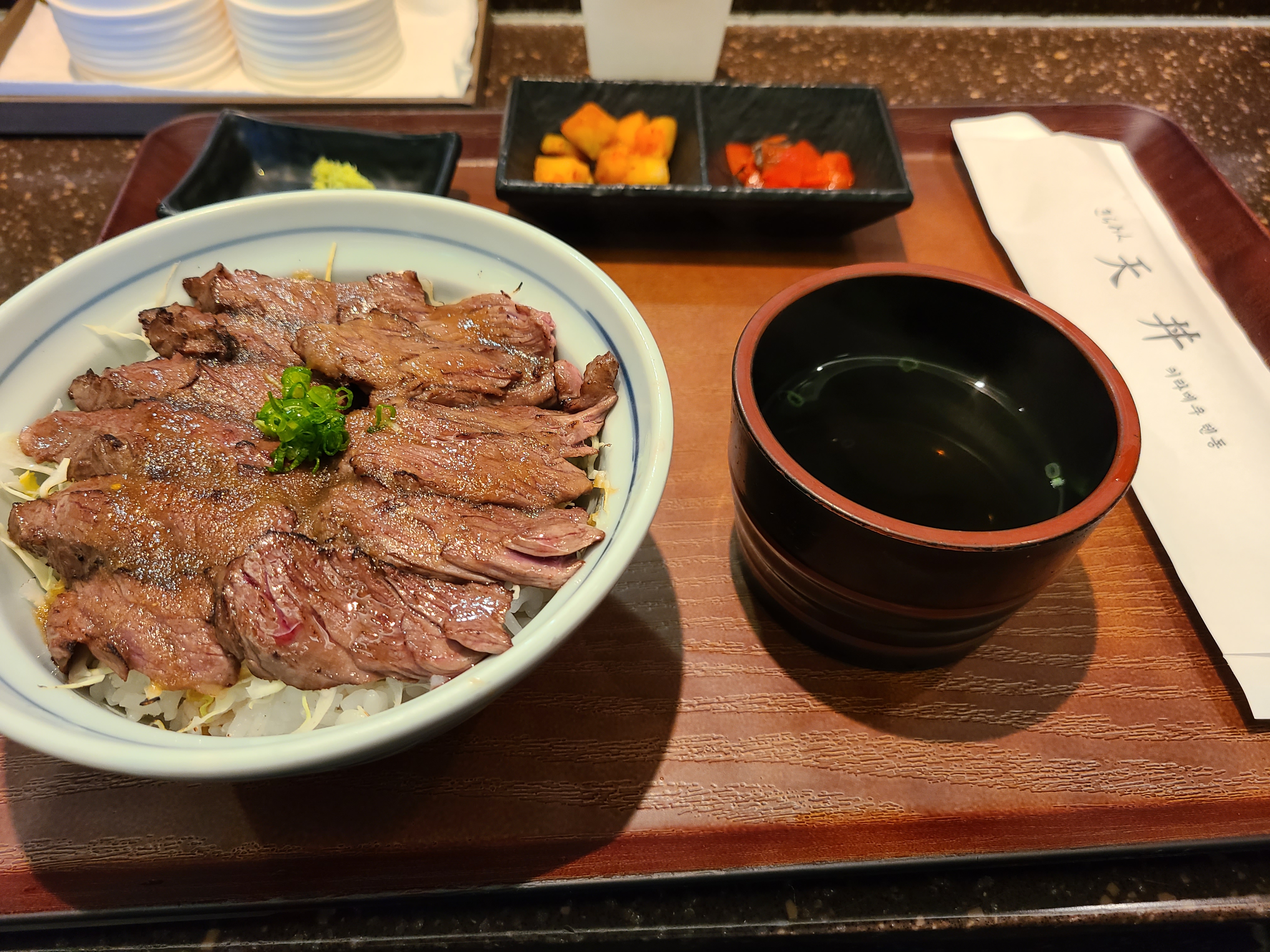 겉으로 보기에는 평범해 보이는 스테키동이지만 함께 먹으면 굉장히 맛있습니다.